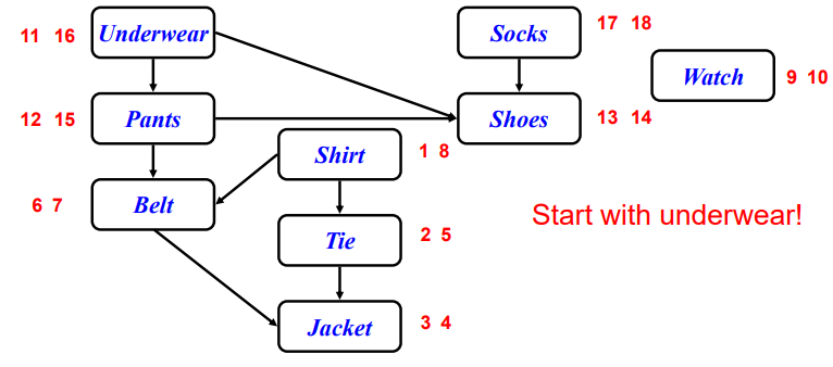 예를 들어 shirt -> tie -> jacket을 보면 이 순서로 입어야 한다. tie -> shirt 이런 순서는 불 가능하다.