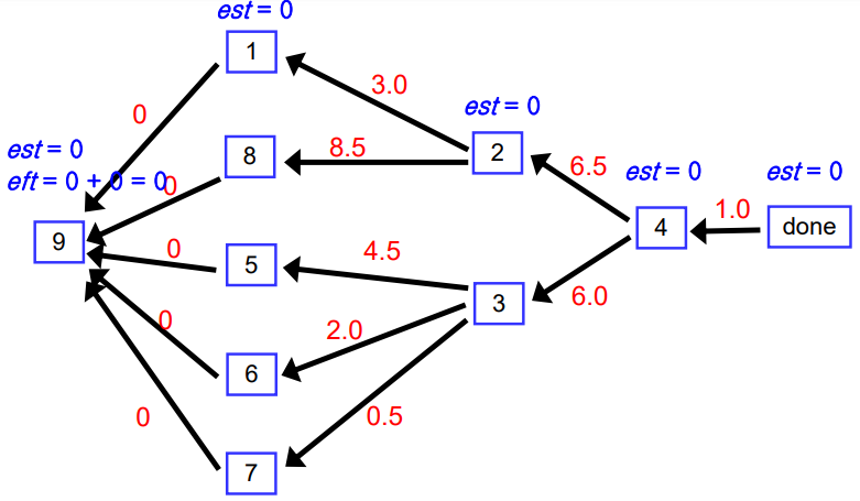 맨 왼쪽 노드의 est 는 이제 시작 노드이므로 0으로 설정한다.