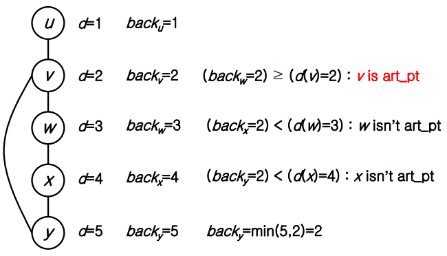 v 노드의 경우 child의 back은 2 이고 자신의 d의 값이 2 이므로 v는 articulation point가 된다.