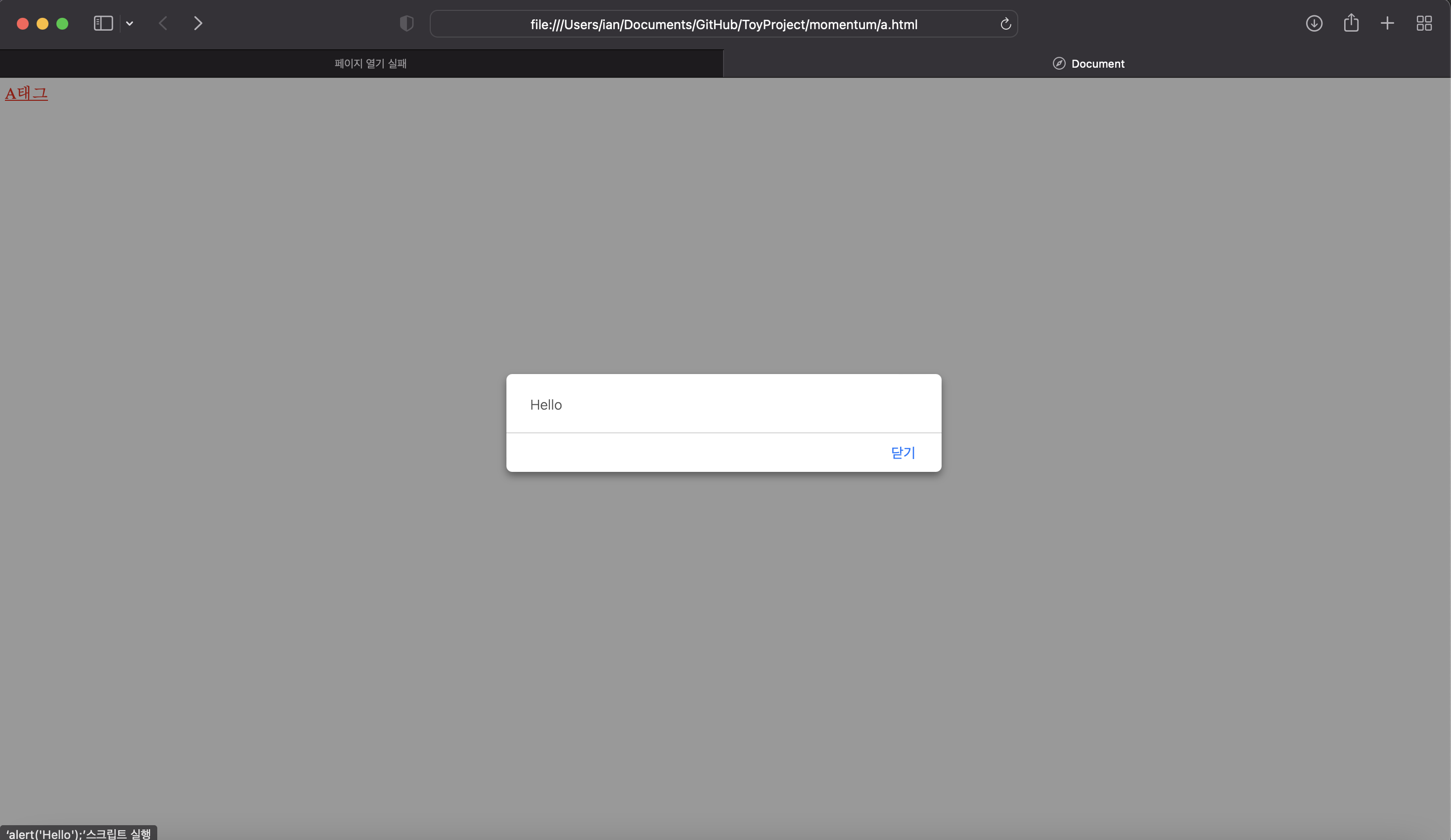 <a href=”javascript:alert(‘Hello’);”>A태그</a>