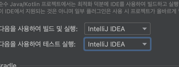 이 설정을 해주는 이유는 gradle을 통해서 자바를 실행 시키는 대신 intellij에서 바로 자바를 실행 시키게 해주어서 속도가 훨씬 빨라지게 하기 위함입니다.